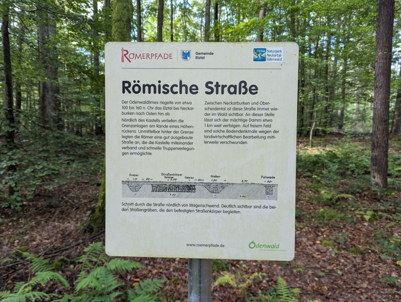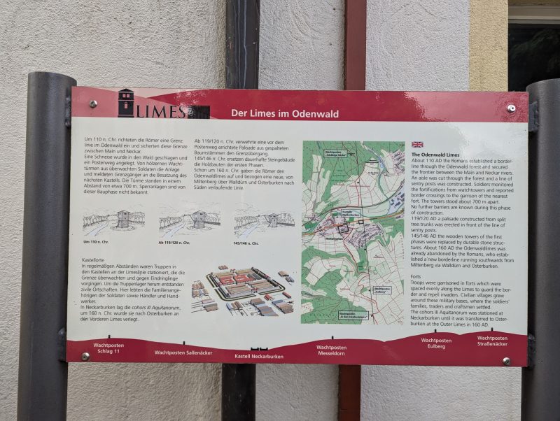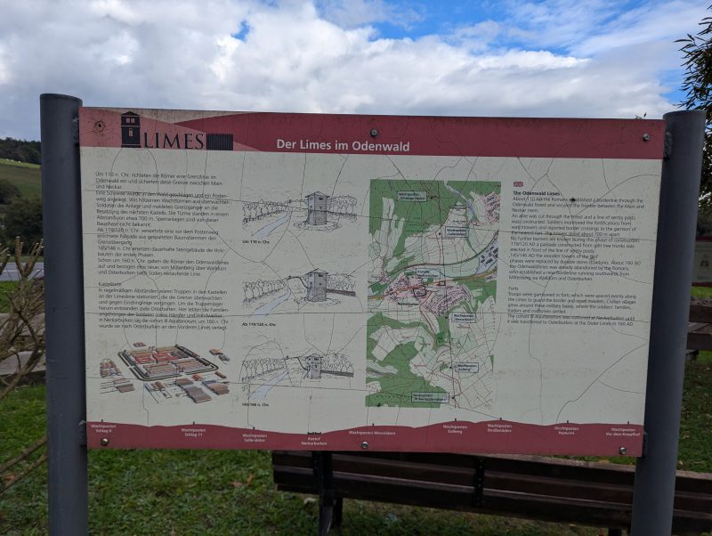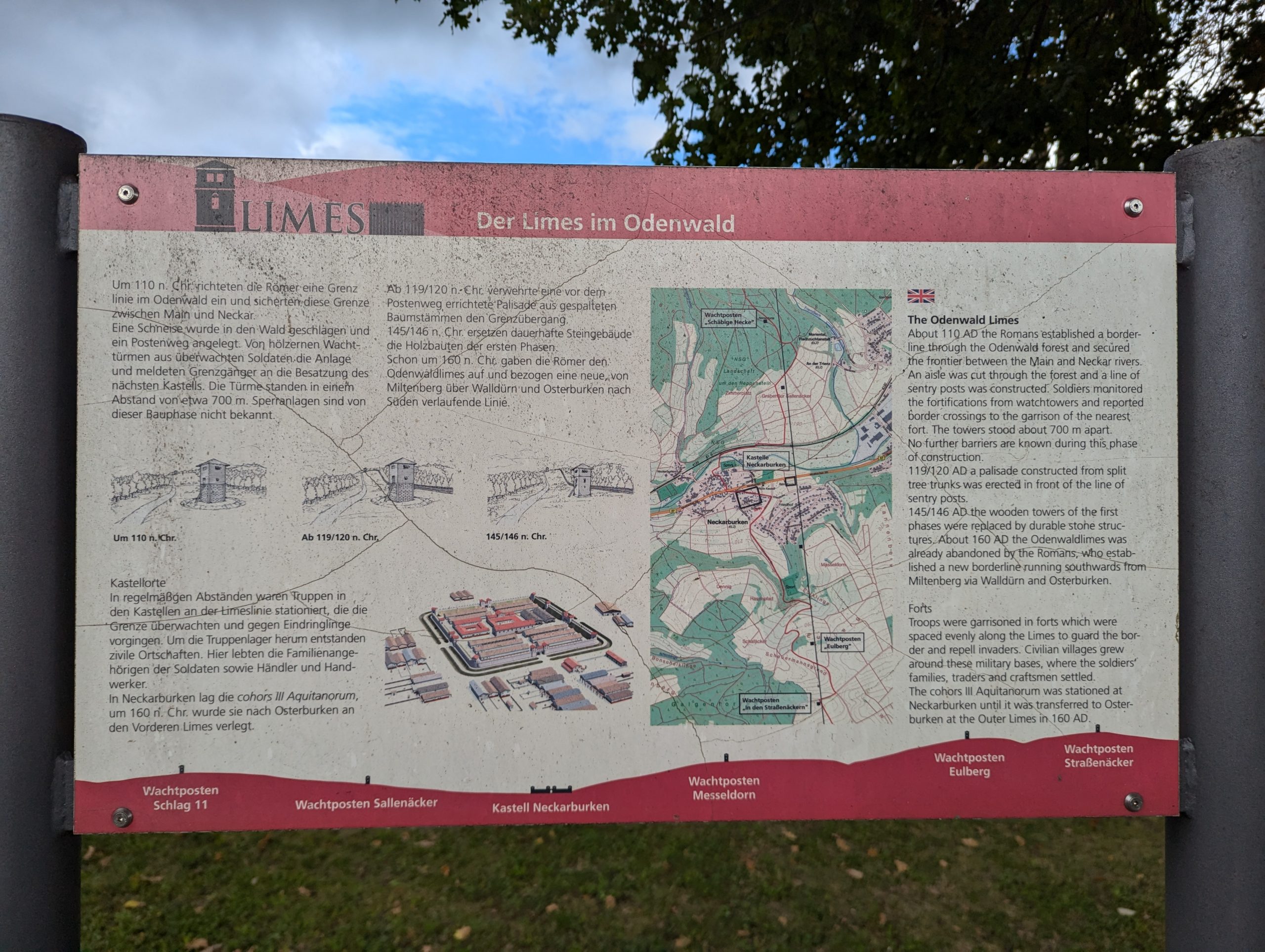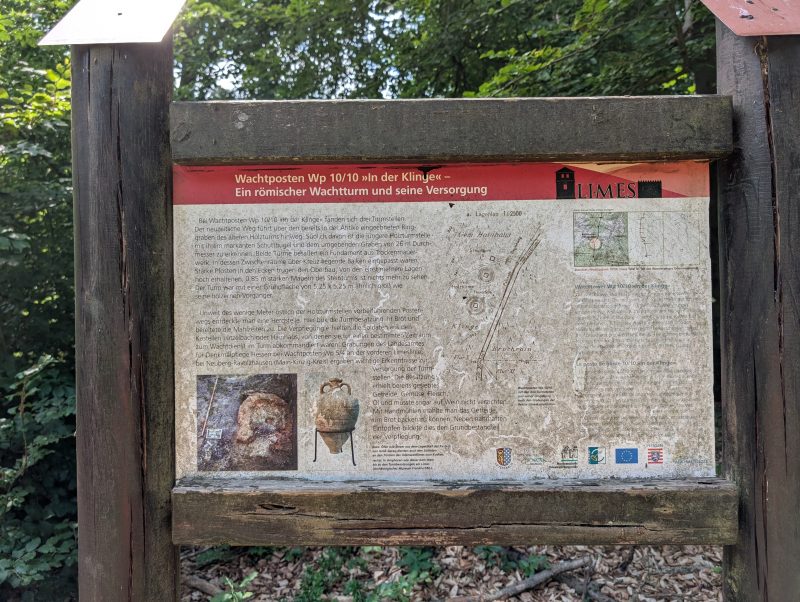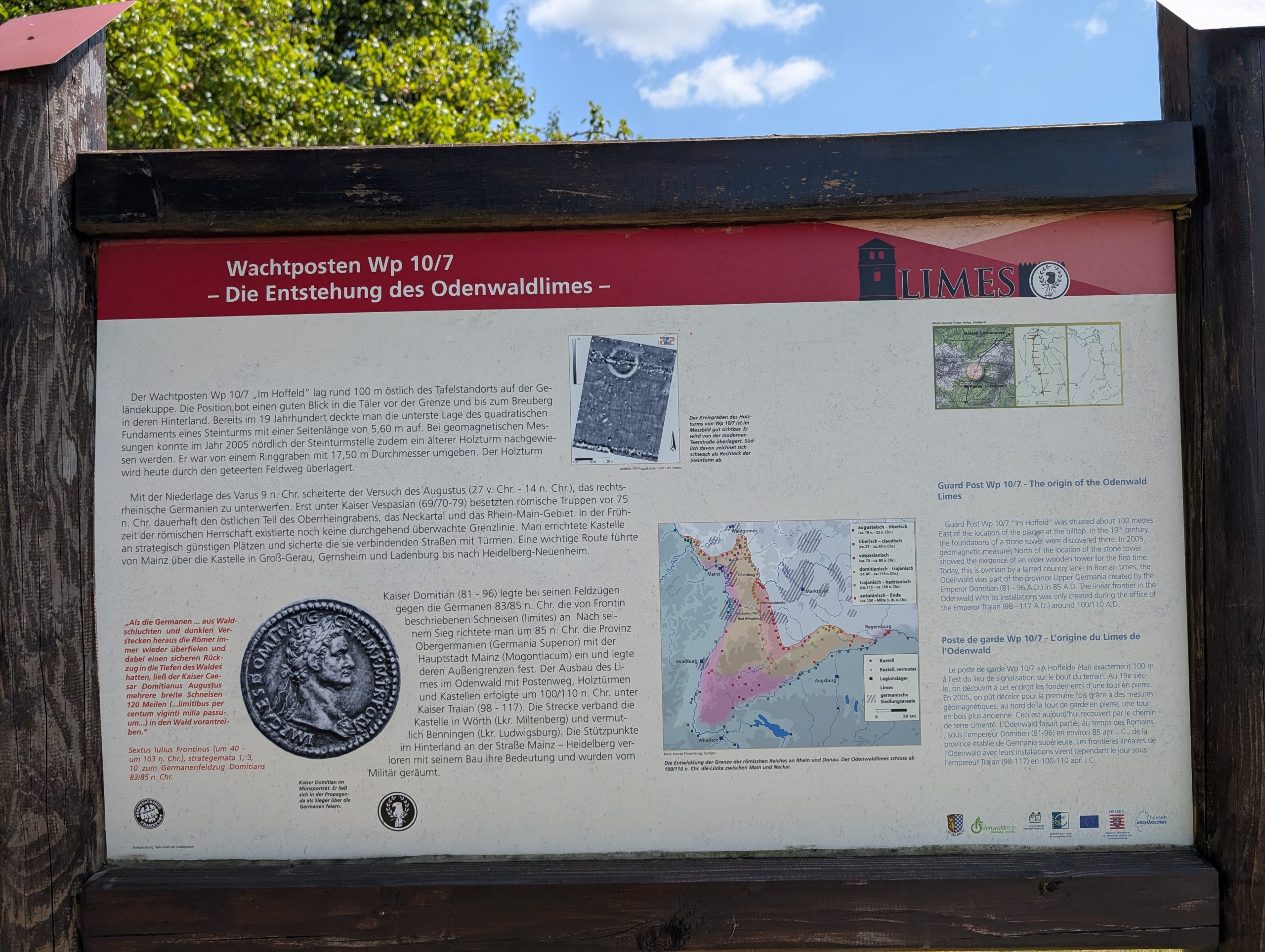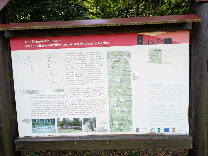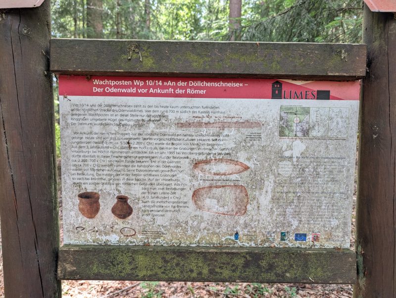 Mitte Juni 2025 ist es sehr warm und wir beschließen, einige Teile des Wanderweges wieder als Tandem-Wanderungen anzugehen. Ausgangspunkt dieser Tour ist ein Wanderparkplatz kurz vor Lützel Wiebelsbach. Mit dem Westlichen Limesweg und etwas später parallel zum Limesweg geht es in Richtung Haingrund. An einer Wegspinne im Wald verlassen wir schon wieder unseren Westlichen Limesweg und folgen dem Weg Br1 an Breitenbrunn vorbei und weiter steil hinab mit Lü2 bis Lützel-Wiebelsbach. Anschließend leitet uns dieser Weg wieder steil den Berg hinauf bis zu unserem Wanderparkplatz. Beeindruckend auf dieser Strecke sind die zwei Kupfermodelle der Kleinkastelle “Auf der Windlücke” und “Numeruskastell Lützenbach”.