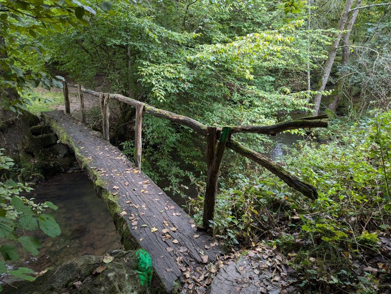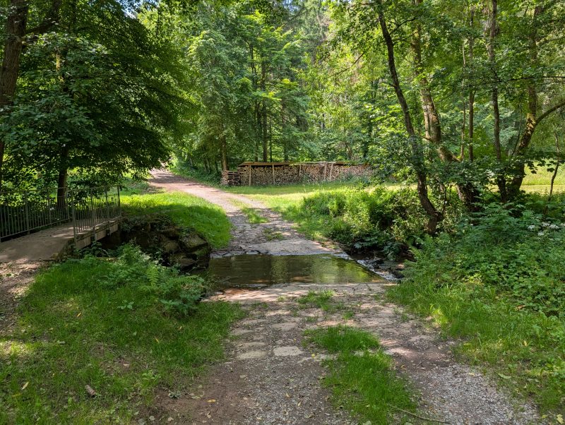 Der erste Teil geht über die Höhen bei Sachsenberg und nur am Anfang der Radtour regnet es noch leicht. Bergab durch ein Seitental auf die obere Butzmühle zu ist ein Flatterband über den Weg gesperrt als Höhenbeschränkung. Mit dem Rad fahre ich einen Umweg, zu Fuß auf dem Rückweg komme ich locker drunter her. Ein Grund für die Sperrung ist auf dem Wegabschnitt nicht zu erkennen.