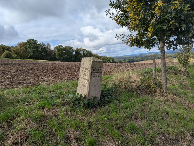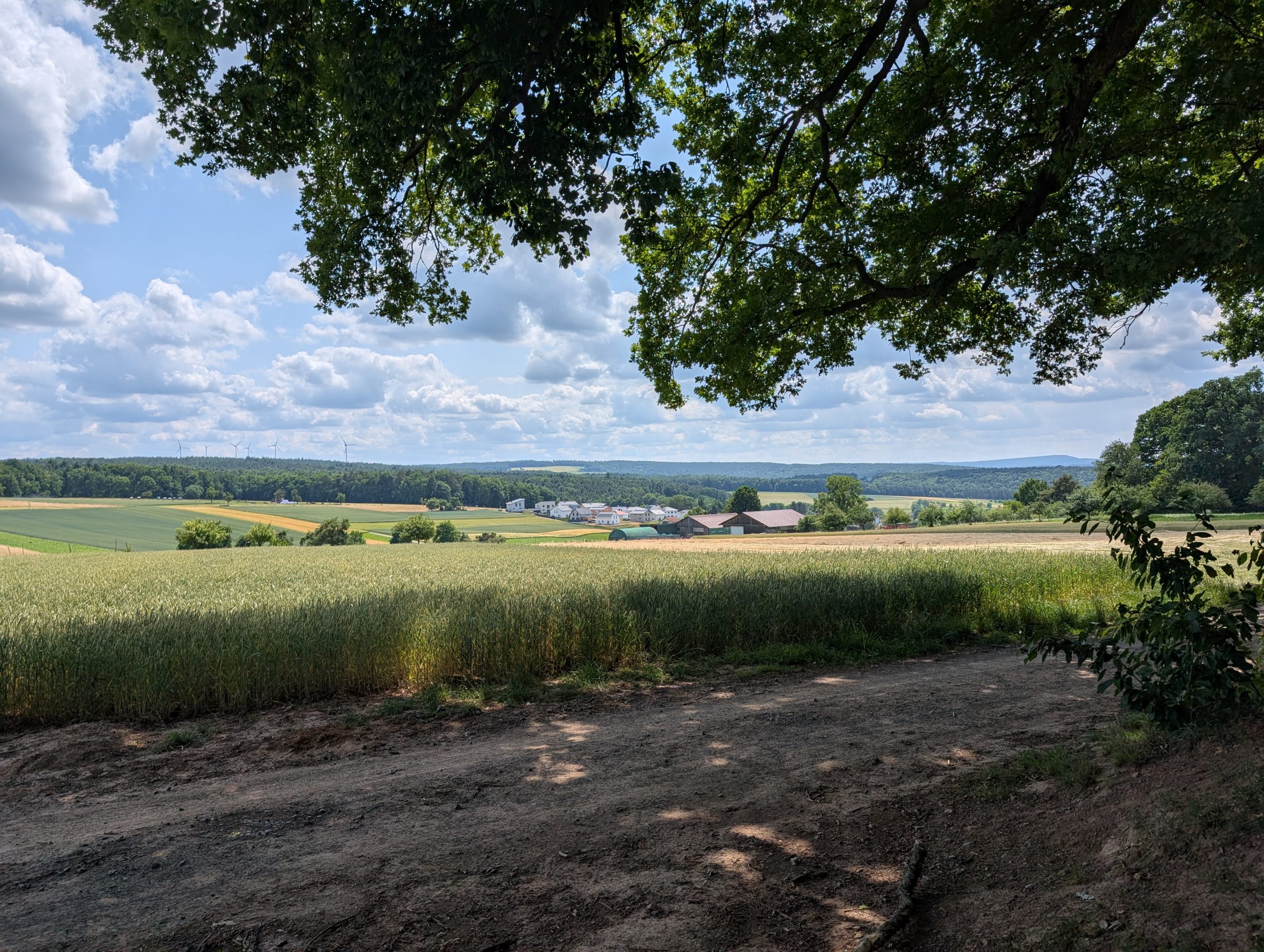 Die Strecke führt von Osten zu dem in Schlüchtern startenden Eselsweg hin, erreicht ihn aber noch nicht. Der Blick geht noch zurück auf die Kegel der hessischen Rhön und voraus auf den Höhenzug des Vogelsberges. Auch ein paar kleine Dörfer wegen durchquert.