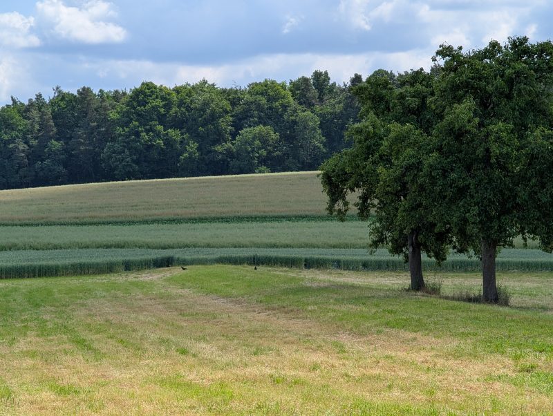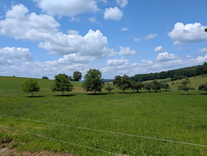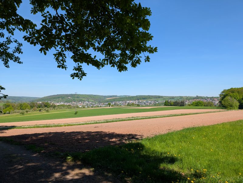Durch Felder und ein Bachtal mit Feuchtbiotop folge ich ihm bis Hohenzell nur ein kleines Stück, dann führt er nach Norden geradewegs auf Schlüchtern zu. Wegen des schönen Hangweges mit Aussicht auf die ersten Spessarthöhen dauerte es hier fast einen Kilometer, bis die Wegabweichung durch einen Blick auf die Uhr erkannt wurde.