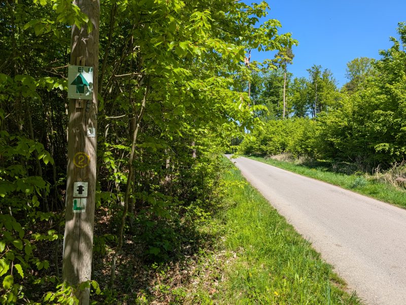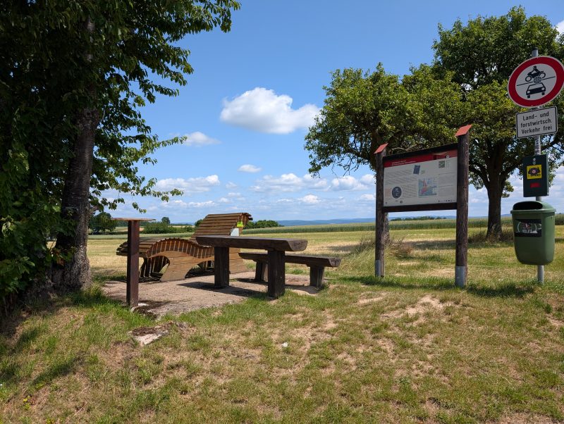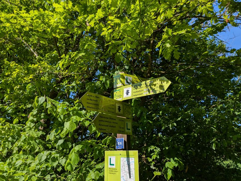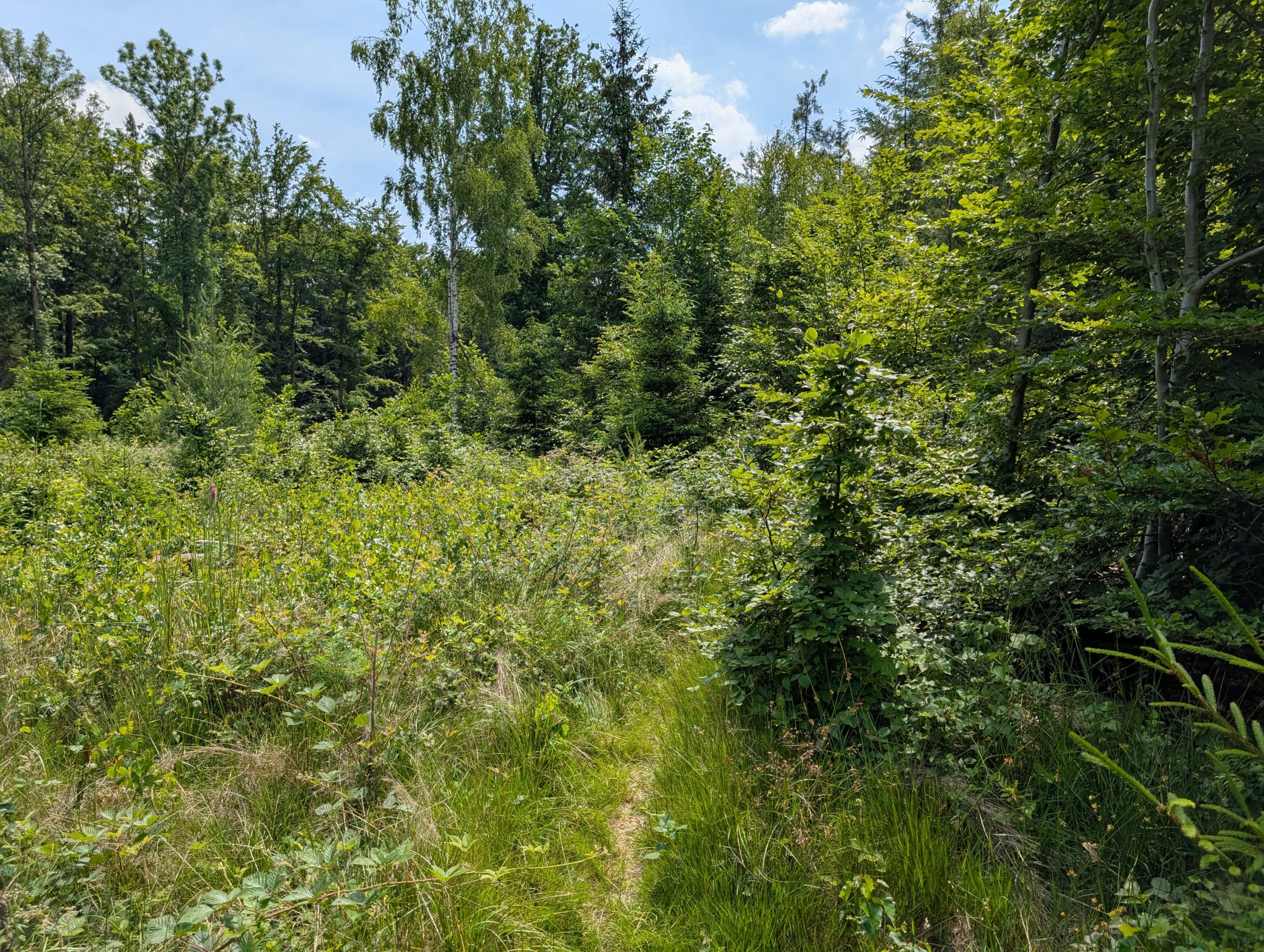 Die Hügelkette im Westen verläuft parallel zur A4 und verteilt die Höhenmeter recht sanft. Da kein Übernachtungsgepäck zu transportieren ist, erfolgt der Aufstieg schnaufend und laaangsam aber stetig. Laxberg (408), ok, aber an der Stellerskuppe (481) hat der Routenplaner nicht aufgepasst. Nein, das war nicht komoot, auf die Radwegemarkierungen gebe ich nichts, es geht nur nach den Wegeklassifizierungen auf den OSM oder Topo Karten. Und da habe ich einen Pfad in die Tour eingebaut, der nicht begehbar weil zugewachsen war.