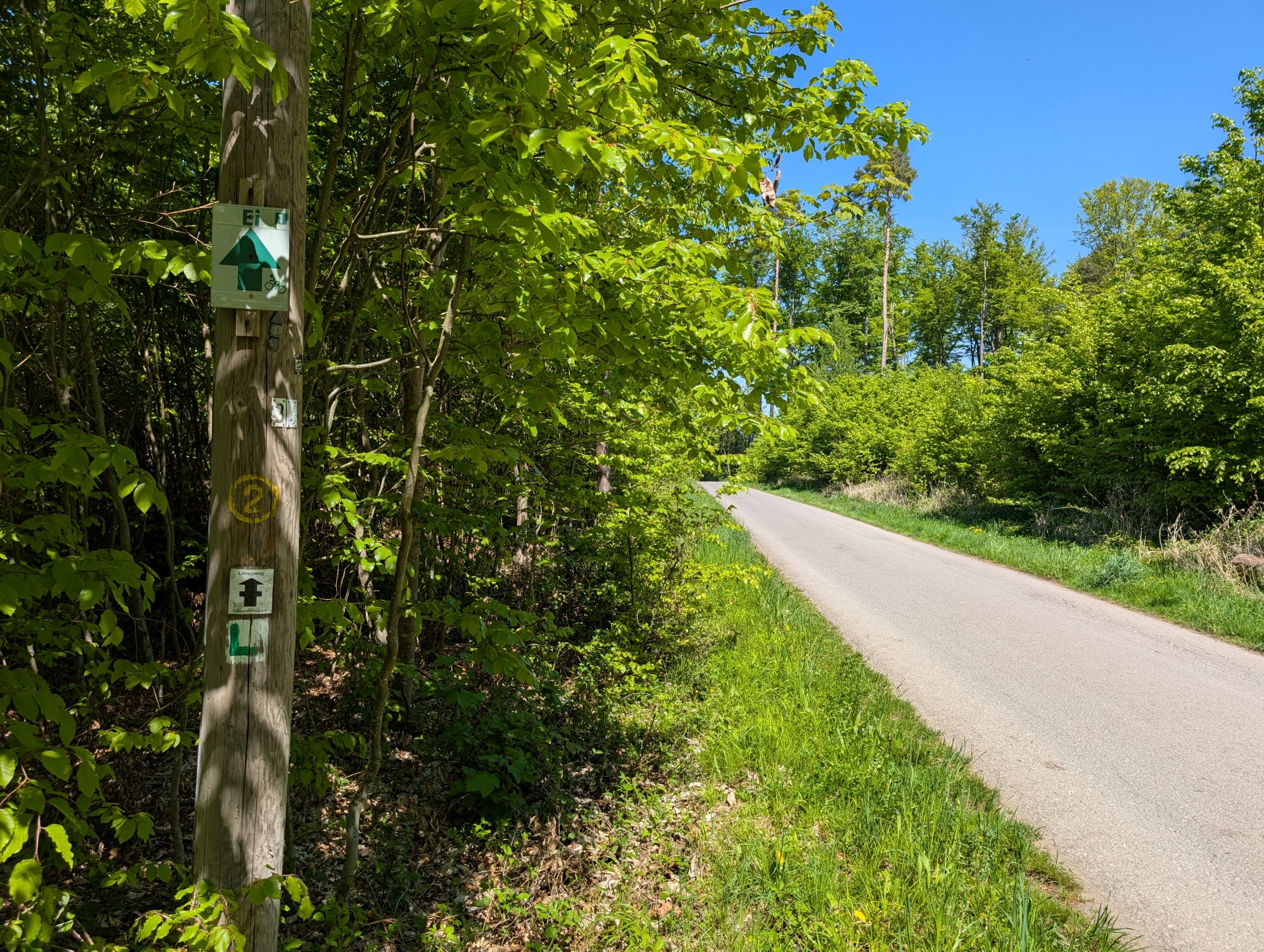 Dafür ging es auf dem Rückweg über den Eschenberg, den wegen seiner Höhe von 535 Metern ein Gipfelkreuz ziert. Der Weg dahin im Sonnenschein, sehr schön.