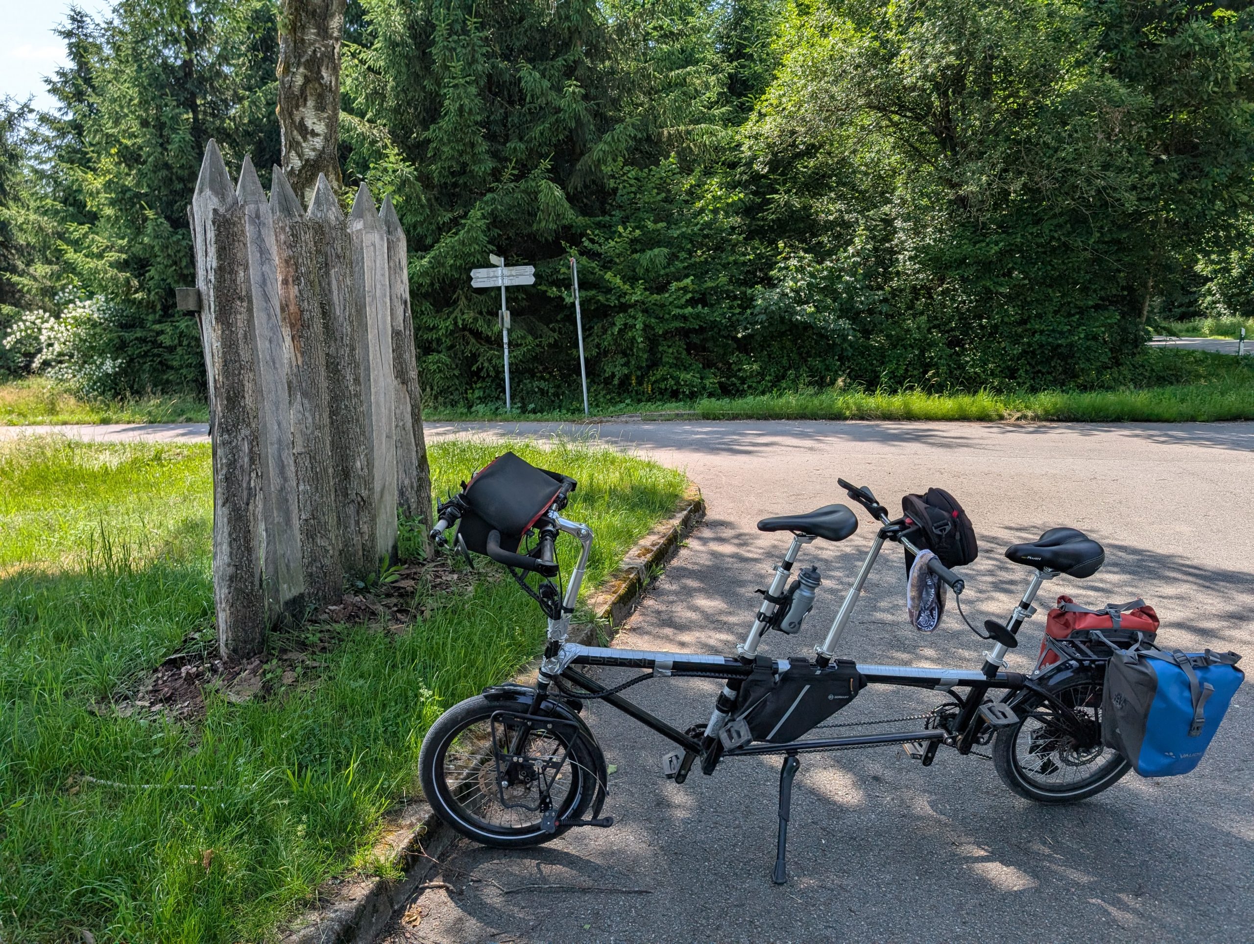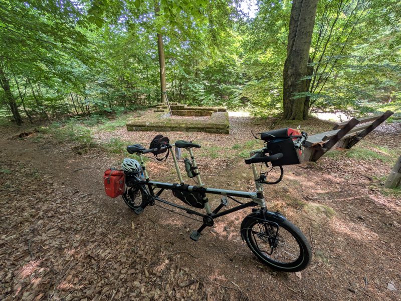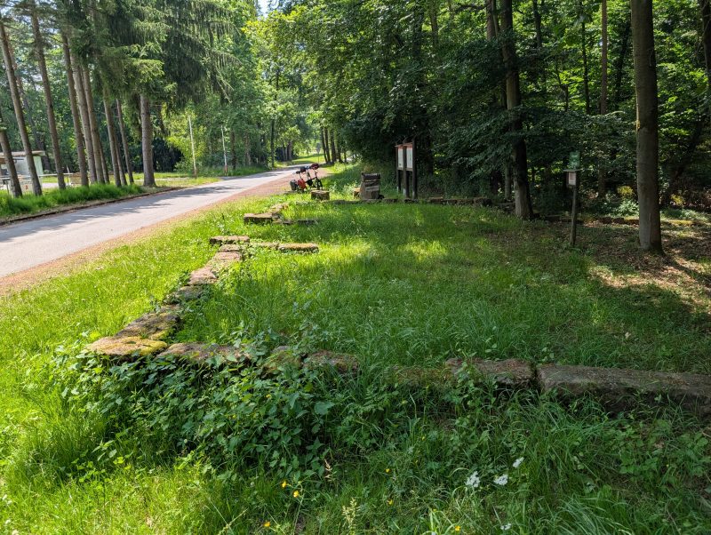 Wir wollen diese Tour wieder als Tandem-Wanderung gestalten. Startpunkt ist der Wanderparkplatz auf der L3349 in der Nähe des Kleinkastell Windlücke. Von hier aus folgen wir dem Limeswanderweg in Richtung Vielbrunn, der parallel zur L3349 verläuft. Aufgrund von Waldarbeiten müssen wir ein kleineres Stück über die Straße fahren. Außerdem ist der Westliche Limesweg insgesamt auf diesem Abschnitt extrem zugewachsen, so dass viele Zecken immer wieder von den Beinen entfernt werden müssen und sogar das Schieben des Tandems kaum möglich ist. Wir kommen am Kastell Hainhaus vorbei. Der Römische Limes-Wachturm kurz vor Vielbrunn liegt allerdings direkt an der Landesstraße und der Wanderweg führt nicht daran vorbei. Bis nach Vielbrunn verläuft der Westliche Limesweg zusammen mit dem “Einhardweg”, ein Wanderweg der von Seligenstadt bis Michelstadt führt. In Vielbrunn verlassen wir wieder den Limesweg und es geht weiter zuerst mit HW 18 und dann über den Ohrenbach-Weg in Richtung Bremhof. Durch den Wald fahren wir anschließend zurück zu unserem Wanderparkplatz.