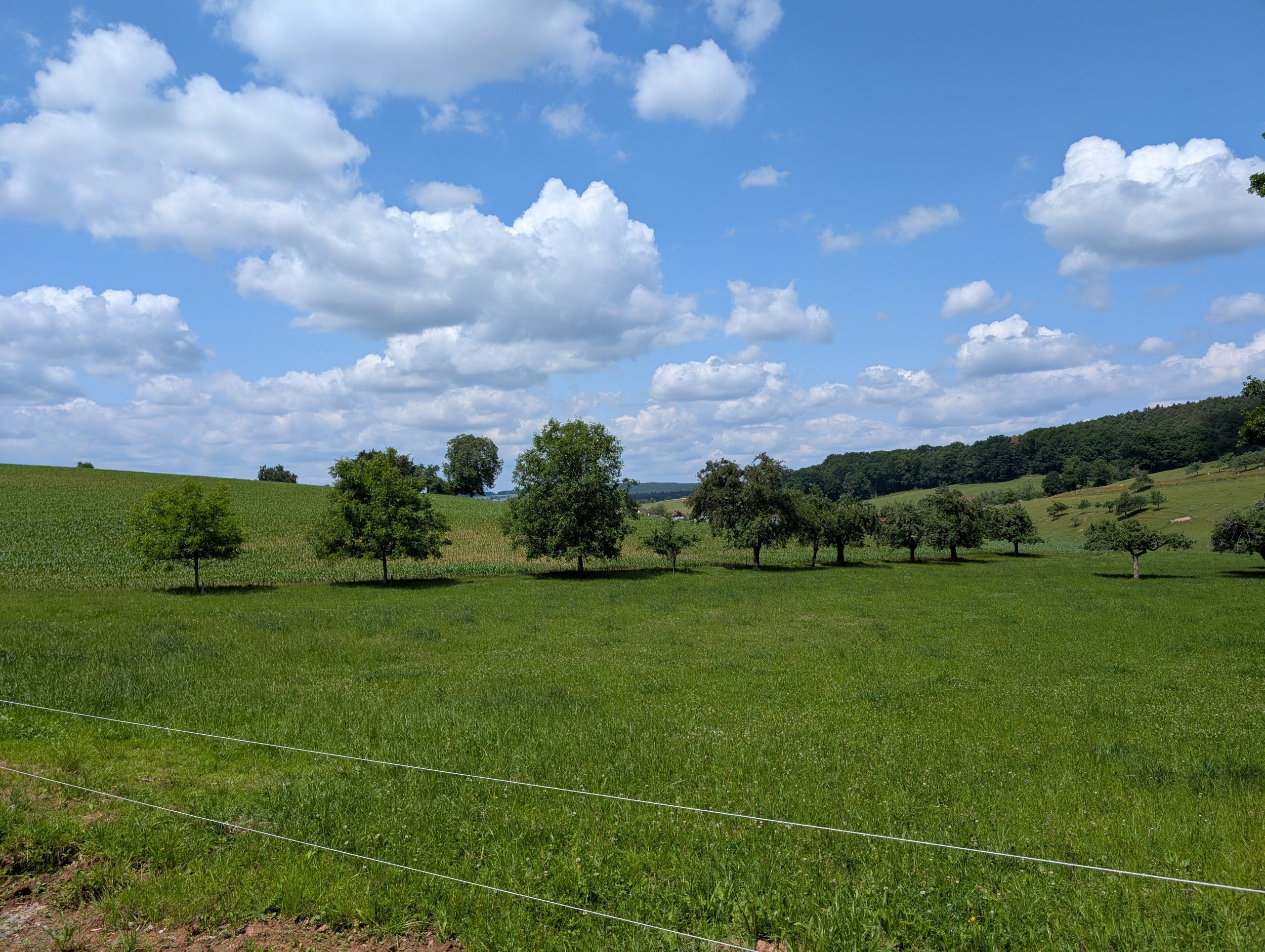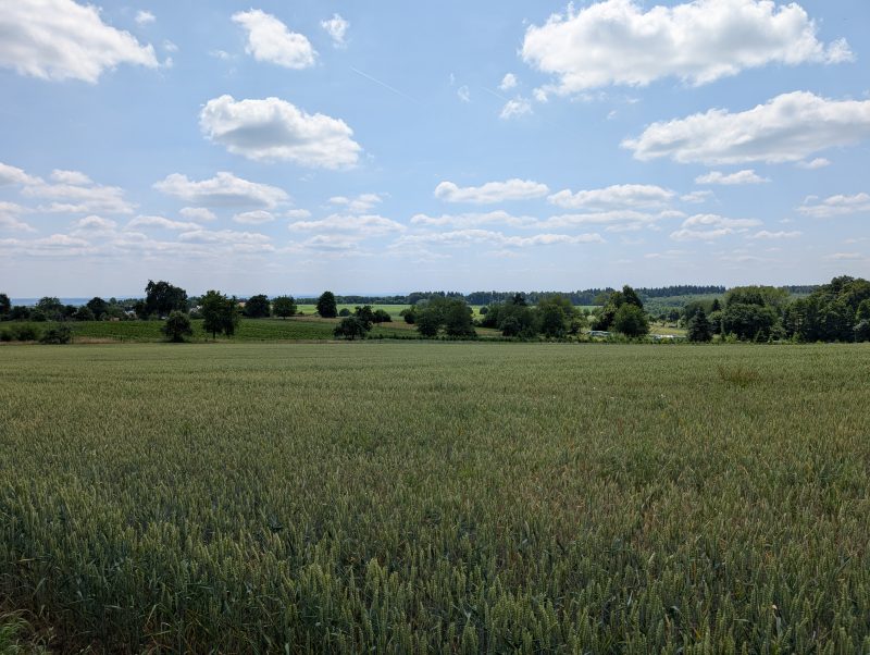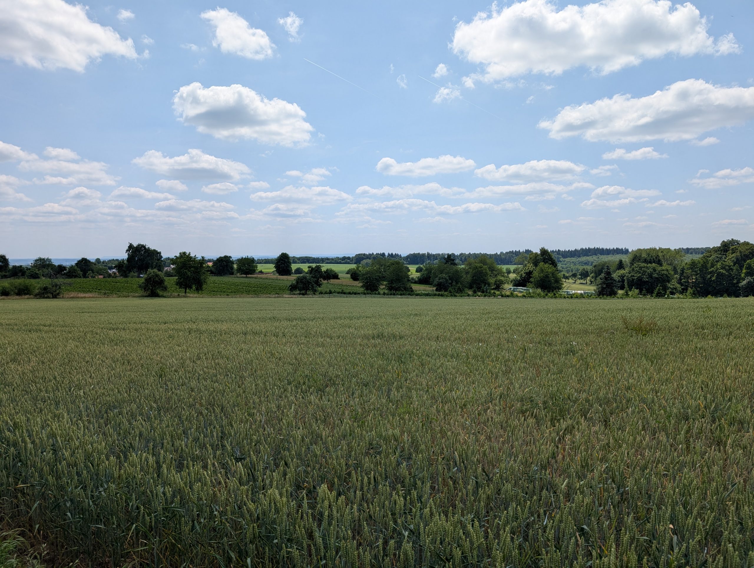 Die Weiterfahrt zum schon bekannten Parkplatz war kein Problem. Dann die längste Etappe begonnen. Über Felder, dann in Seitentäler eintauchend und wieder nach oben auftauchend waren die ersten 10 Kilometer Wandergenuß pur. Die restlichen fünf konnte man auf überwiegend gut begehbaren landwirtschaftlichen Wegen den Blick und die Gedanken schweifen lassen.