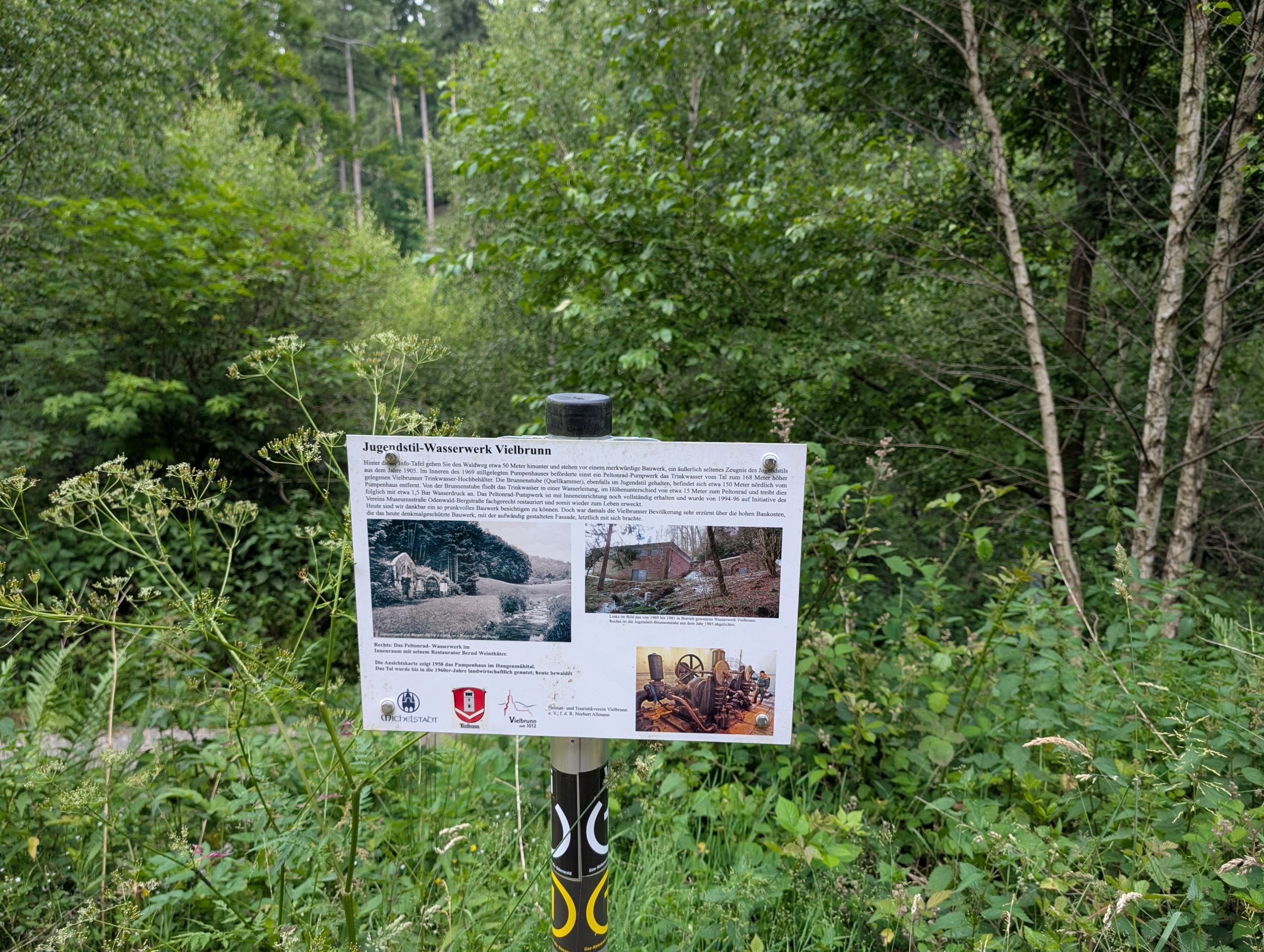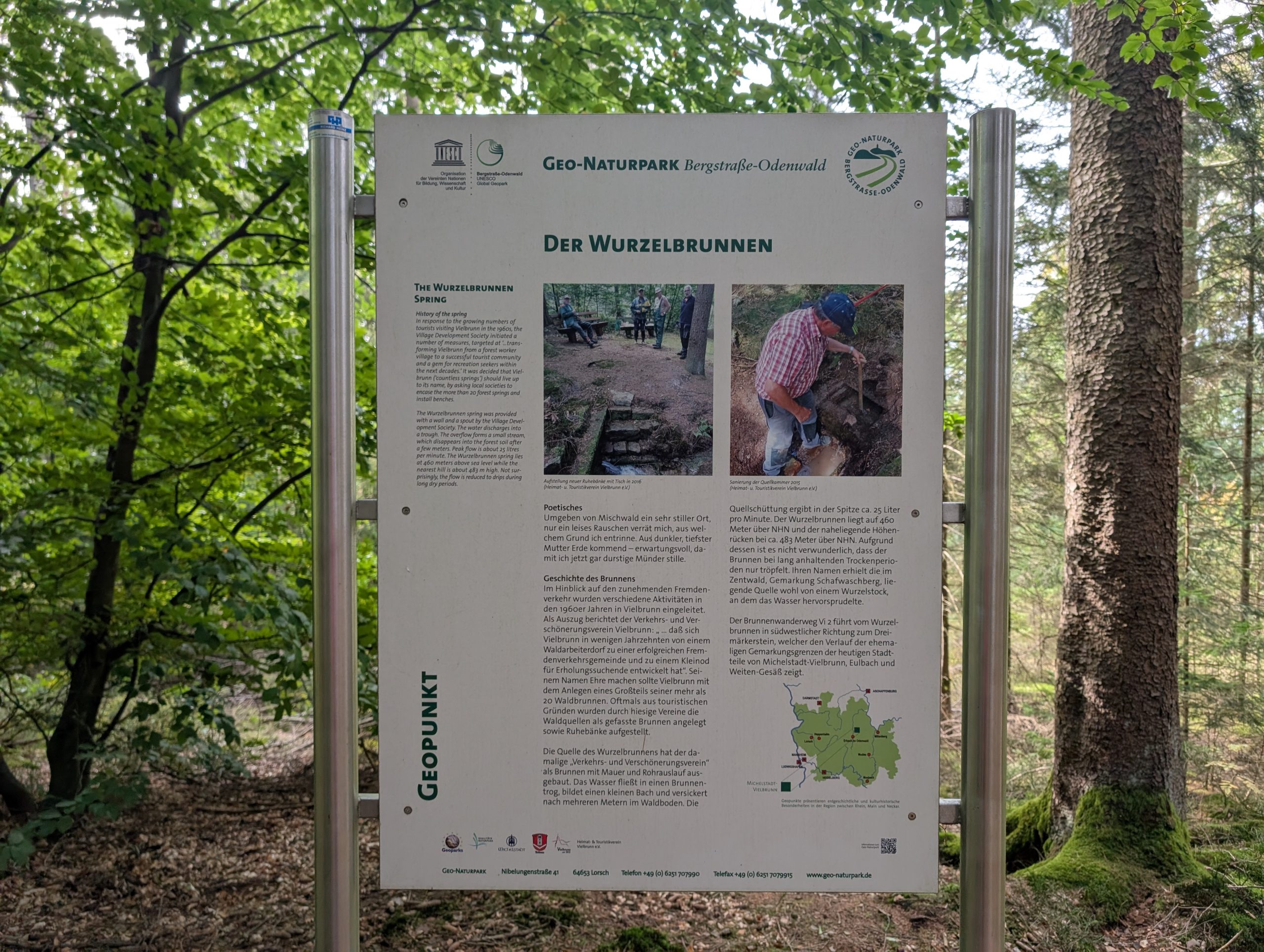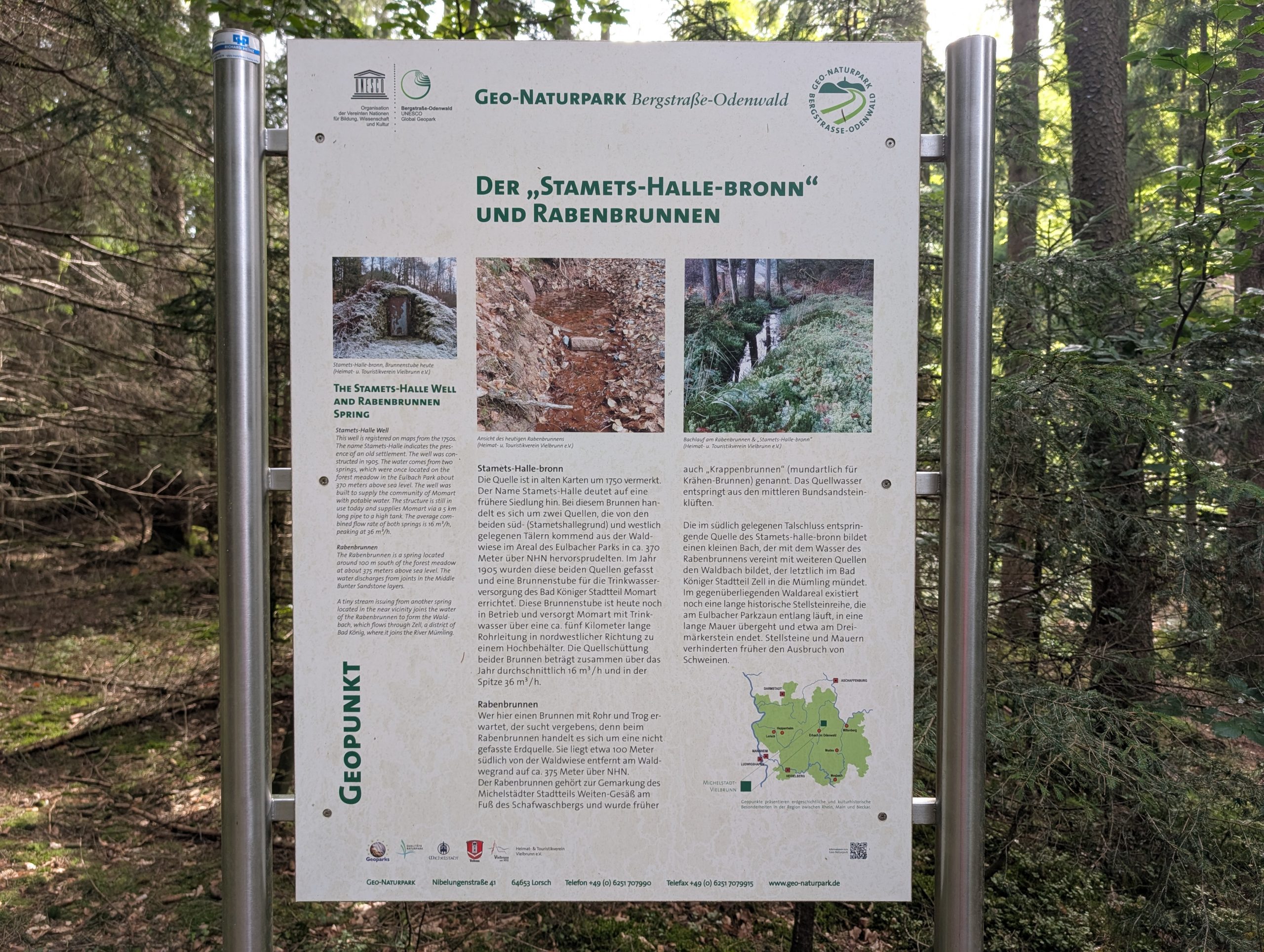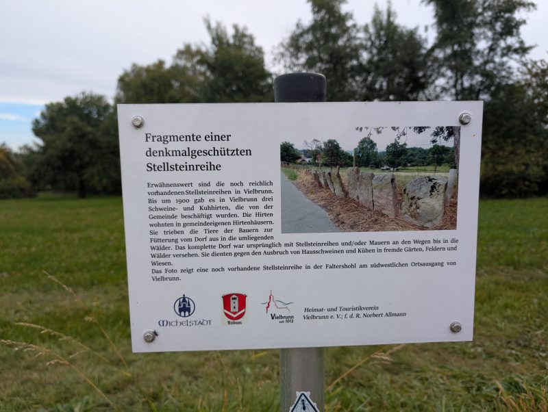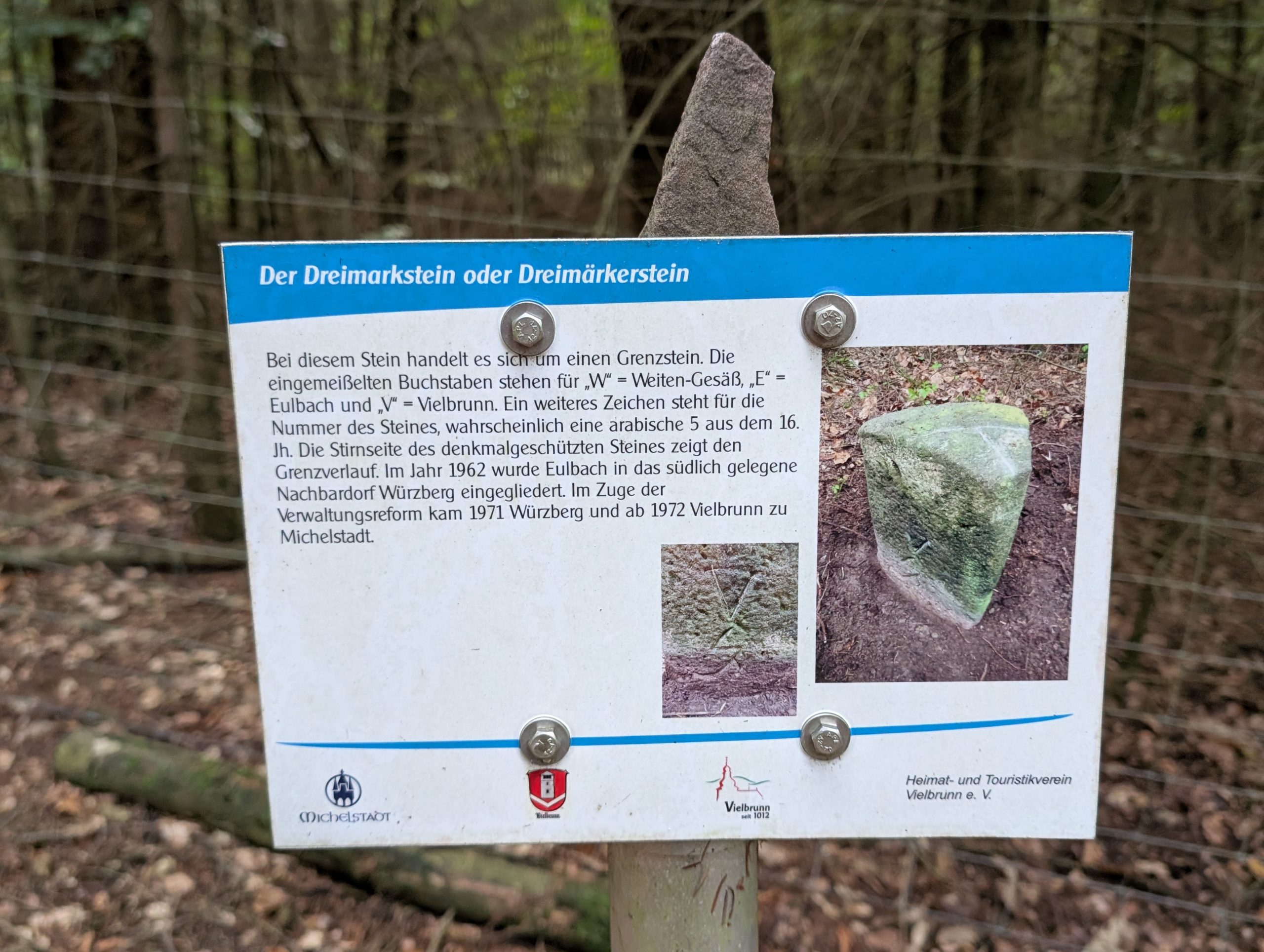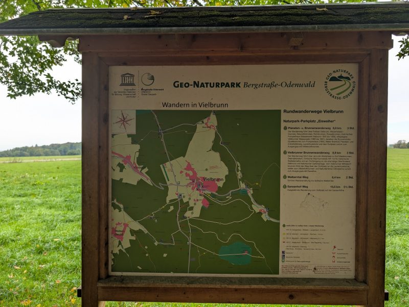 Von einem Wanderparkplatz südwestlich bei Vielbrunn gelegen, starten wir unsere Tour. Ein großer Teil des Weges folgt dem örtlichen Wanderweg Vi 2. Vom Parkplatz aus geht es zuerst in Richtung Vielbrunn. In der Nähe des Dorftes treffen wir auf den Westlichen Limesweg und Einhardweg, der uns bis zur L3349 führt. Ein Stück müssen wir entlang der Straße wandern. Dann biegen wir mit Vi 2 ab in den Wald. Es geht vorbei an dem Rabenbrunnen, entlang des Bachtals und dann wieder steil hinauf zum Wanderparkplatz. Unterwegs gibt es noch einige interessante Hinweistafeln.