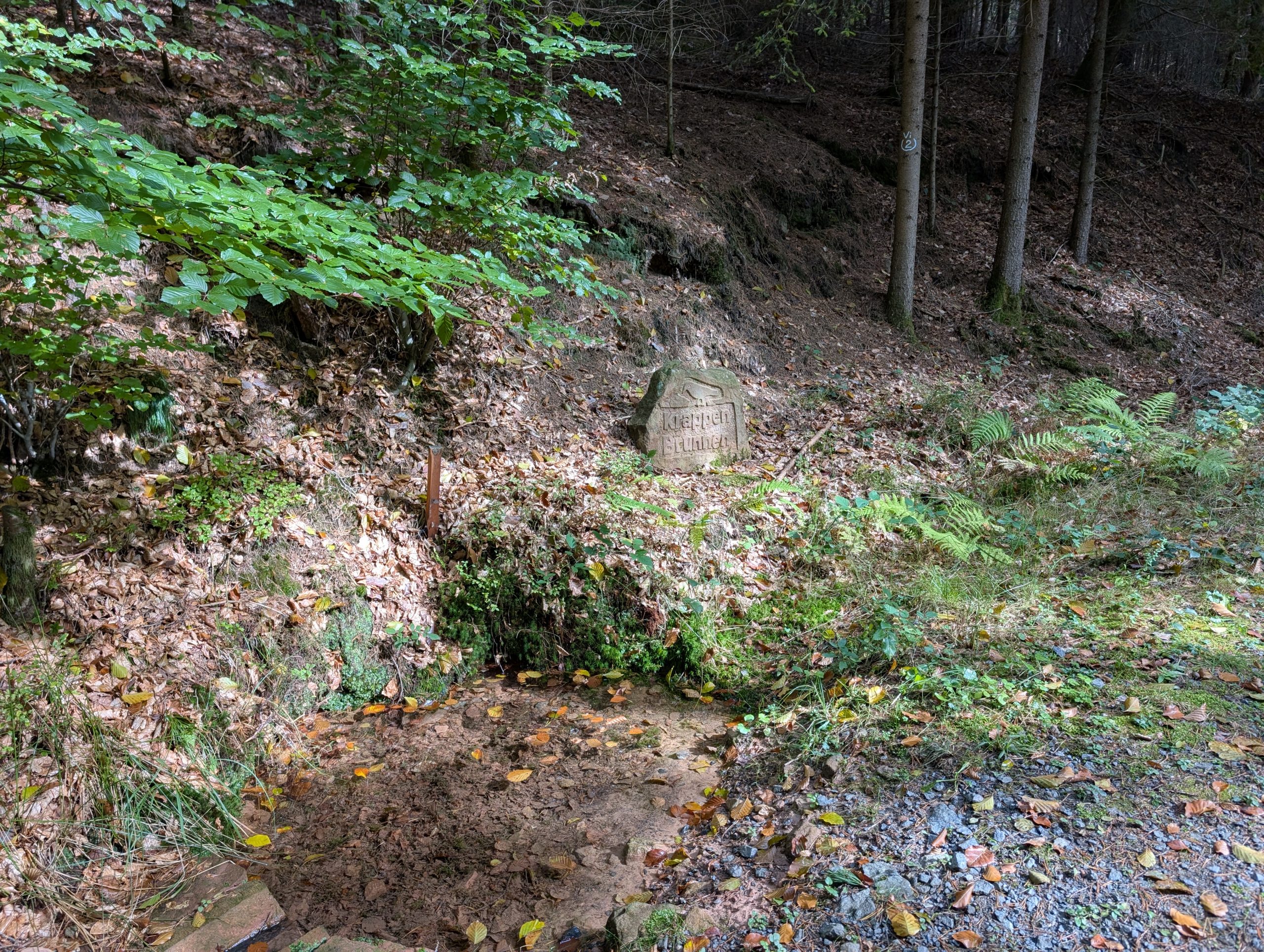 Daher führt der gewählte Waldweg an der Steigkoppe (502 m) und am Steigkopf (423 m) vorbei ins schon erwähnte Tal hinunter.