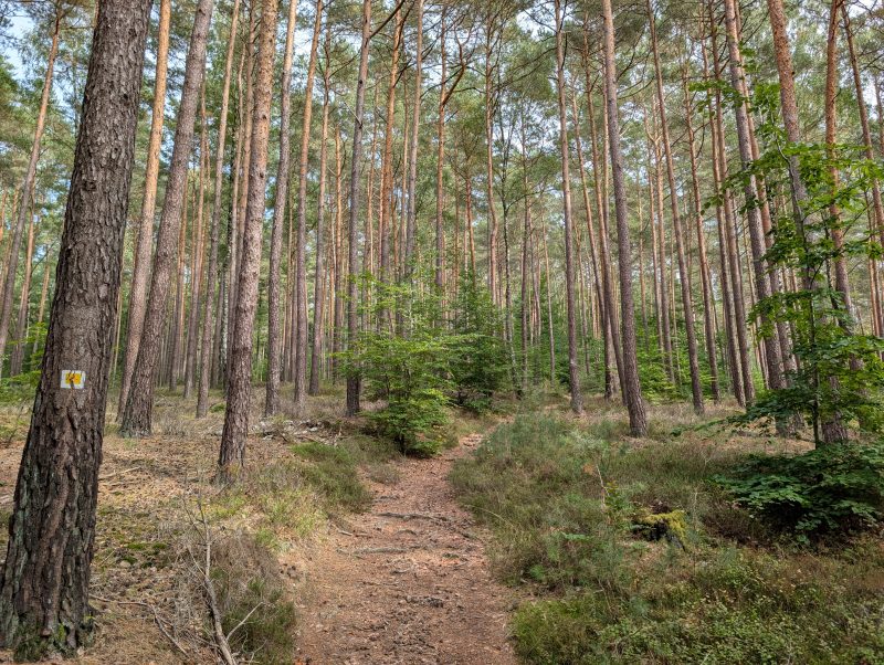 Daher gibt es hier die zwei Randertouren vom vorletzten Tag und eine kleine Radrunde Richtung Geiersberg als Geste des Willens das angefangen auch zum abgeschlossenen zu machen. Der Hinweg mit dem Rad vom Platz an der A3 zu einem Wanderparkplatz oberhalb von Wildensee hält sich auf dem Höhenrücken und unterscheidet sich nur durch die breiteren Waldwege von Eselsrückweg.