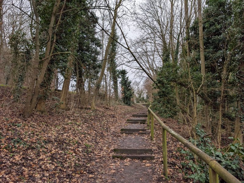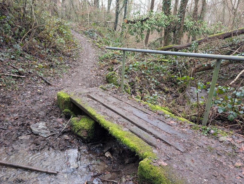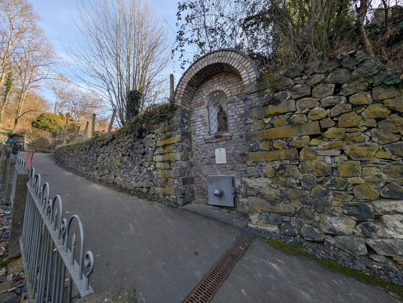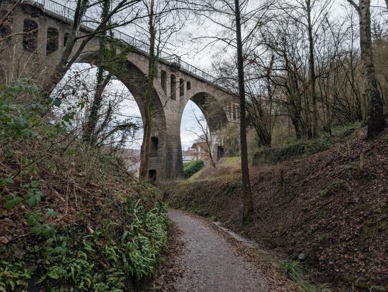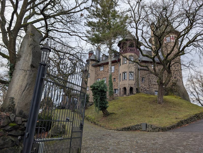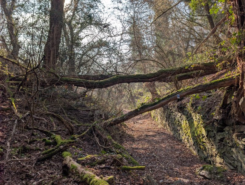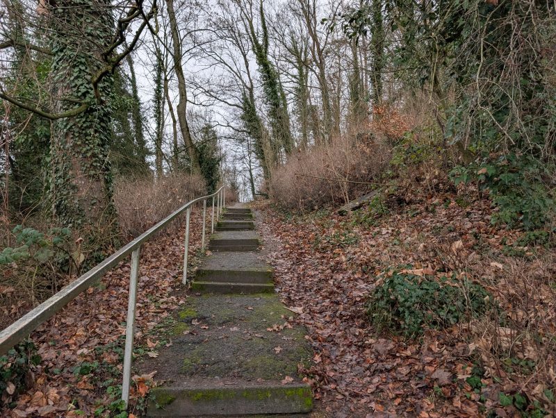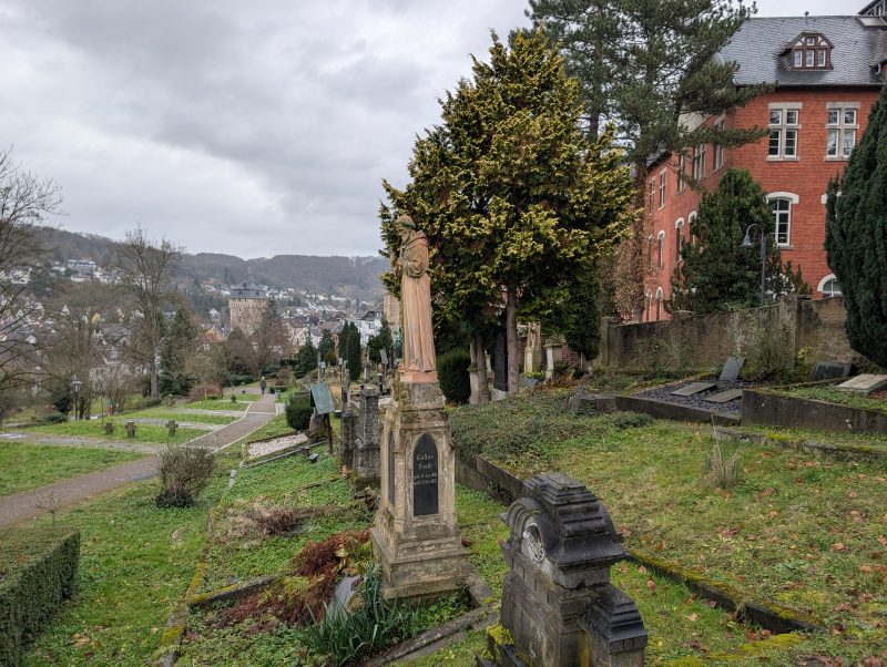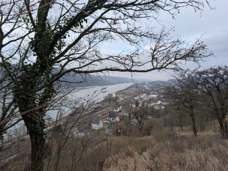 Nach sehr kalter Nacht bleibt es den ganzen Tag trüb und frostig. Eine kleine Laufrunde mit Schleife nach Bad Honnef muss aber sein. Die Laufschuhe haben auf dem gefrorenen Laub gerade noch genug Grip. Sind auch nicht mehr die neuesten. Trotz Navi am Arm wird aber der Aufstieg auf die andere Hangseite des Ohbaches verpasst. Also dann den Bach hinunter durch die Stadt, bis der Track wieder geschnitten wird und dann auf der westlichen Ohbachhangseite wie geplant wieder bergauf. Viel vom Rheinsteig verpasst hat man hier nicht, weil die Strecke in die Stadt auch gelb als Zuweg ausgeschildert war.
