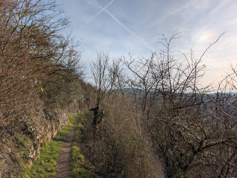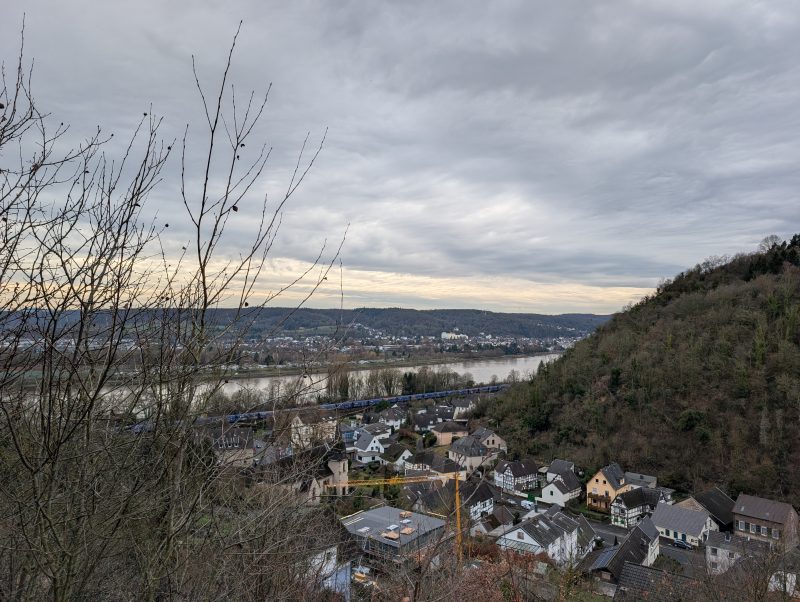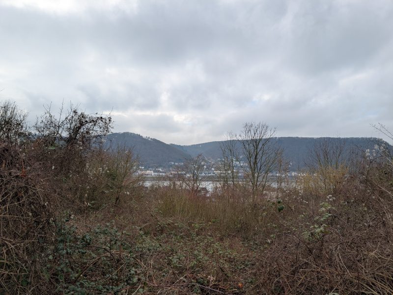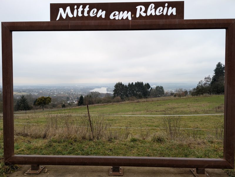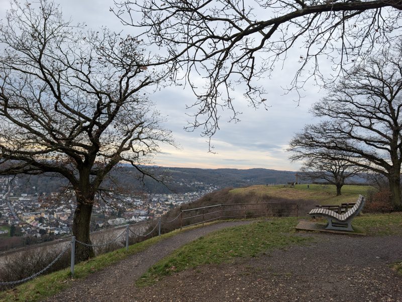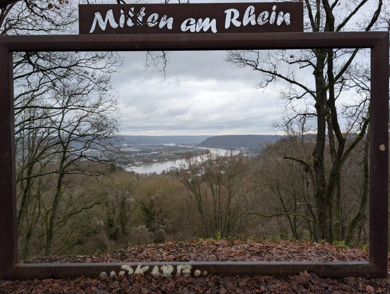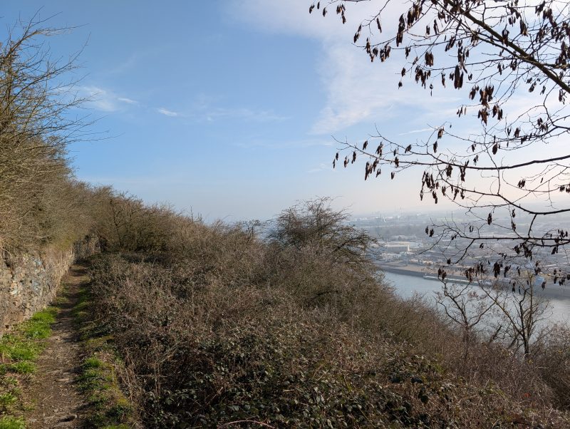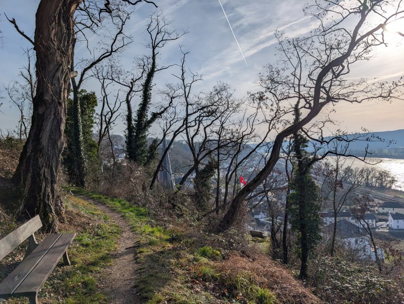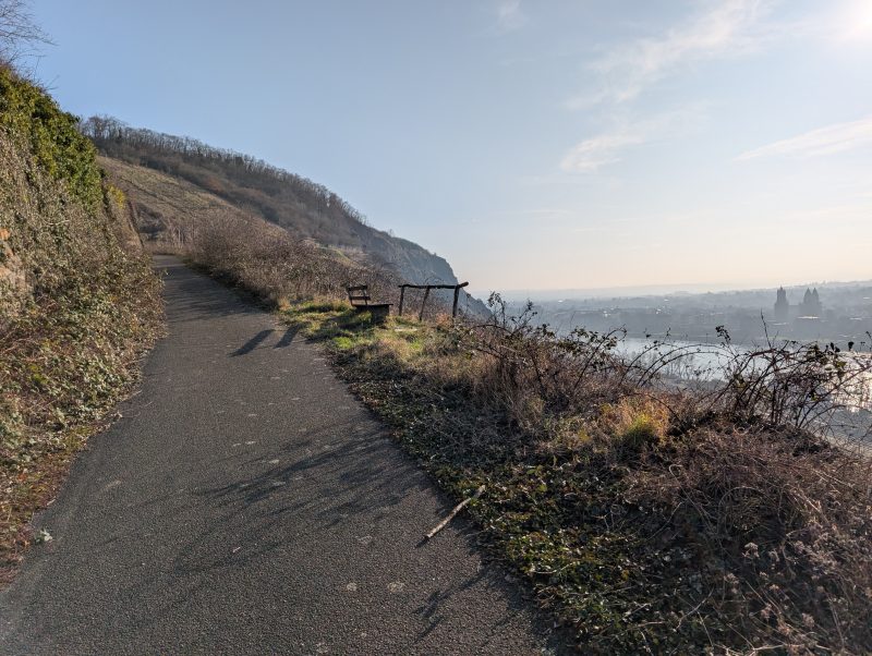 Der Wind ist noch kräftiger und kälter, aber der Rheinsteig am Westhang ist bis auf einen kleinen Abschnitt über eine Wiese auf der Hochfläche gut geschützt. Mit einem Stock wird bis auf einen Anstieg geschlauft, auch wenn die Beine verschiedenste Schmerzorte vermelden. Die Gegend ist auch am 24.12 gut besucht, wenn auch nicht überlaufen. Die Wege sind schmal bis breit, aber nicht wurzelig. Die Aussicht wird an mehreren Kanzelstellen bereitgestellt und zeigt das besiedelte Rheintal von Bad Godesberg bis Bonn.