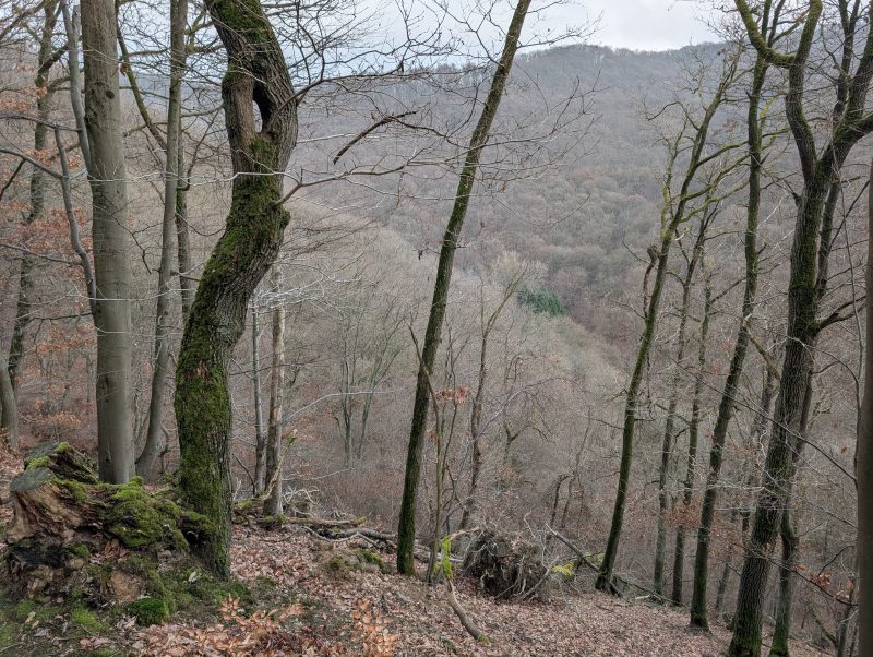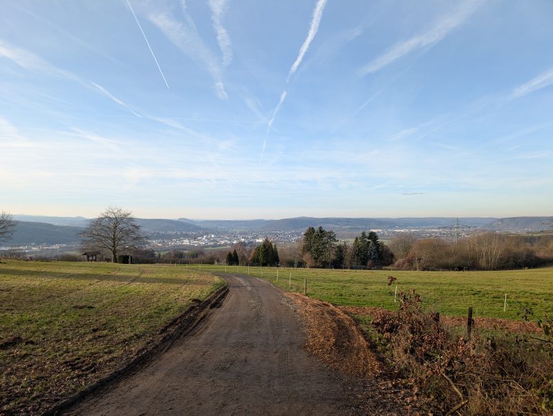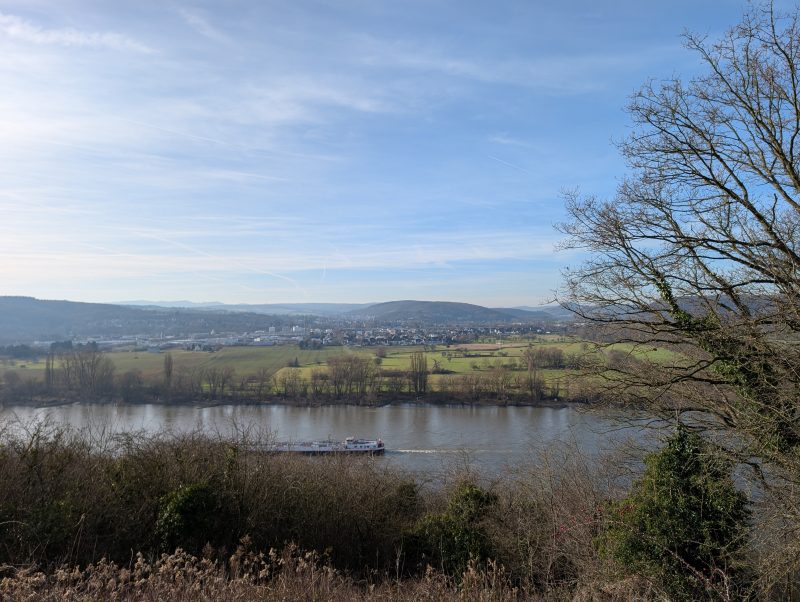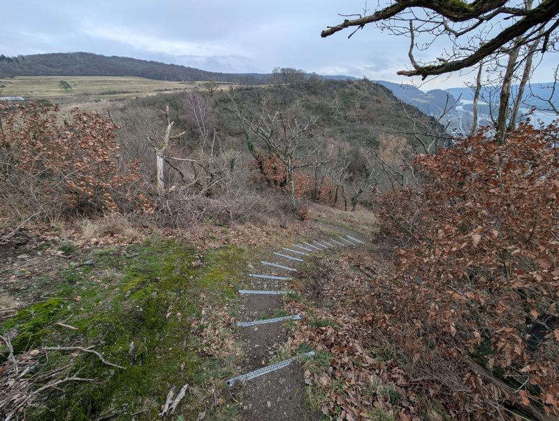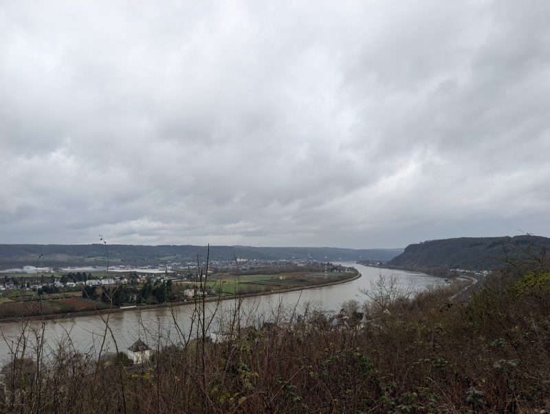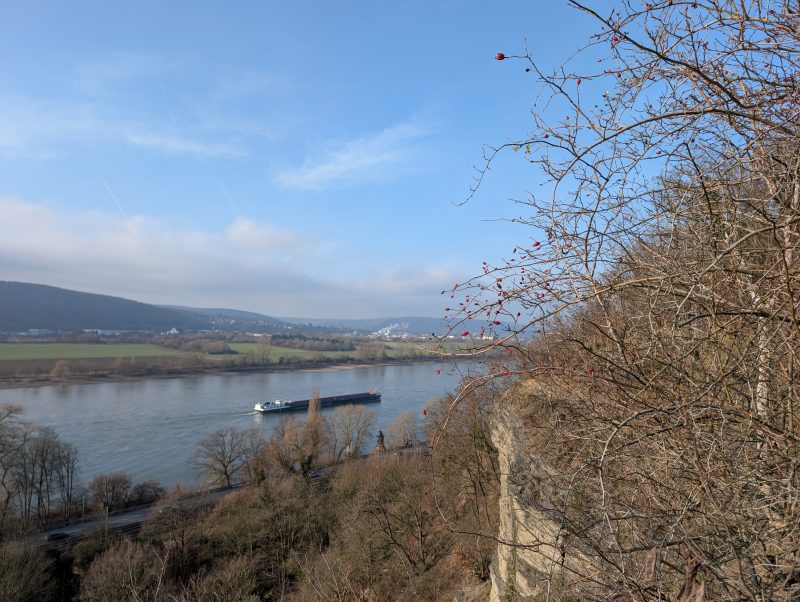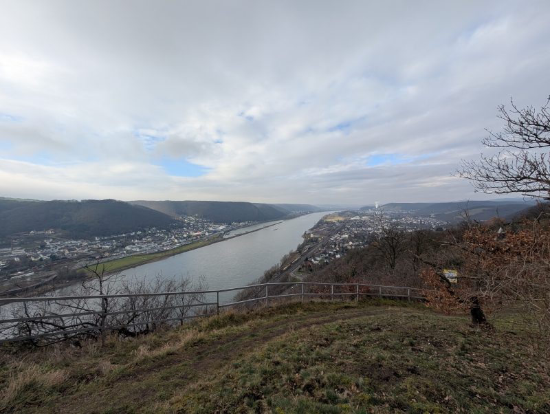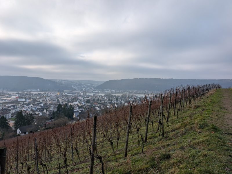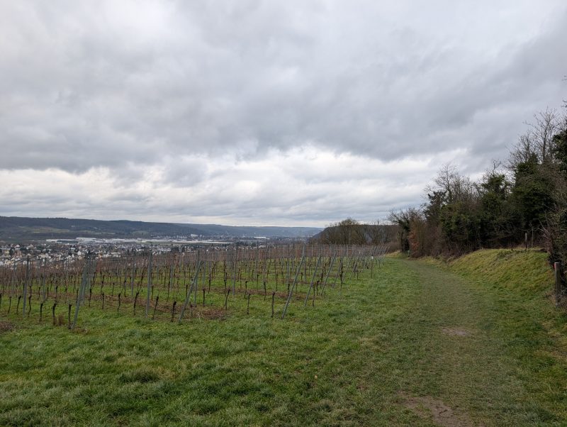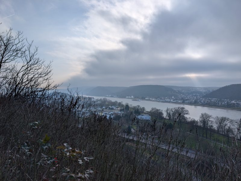 Der Wind ist noch kräftiger und kälter, aber der Rheinsteig am Westhang ist bis auf einen kleinen Abschnitt über eine Wiese auf der Hochfläche gut geschützt. Mit einem Stock wird bis auf einen Anstieg geschlauft, auch wenn die Beine verschiedenste Schmerzorte vermelden. Die Gegend ist auch am 24.12 gut besucht, wenn auch nicht überlaufen. Die Wege sind schmal bis breit, aber nicht wurzelig. Die Aussicht wird an mehreren Kanzelstellen bereitgestellt und zeigt das besiedelte Rheintal von Bad Godesberg bis Bonn.