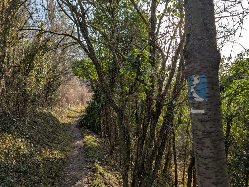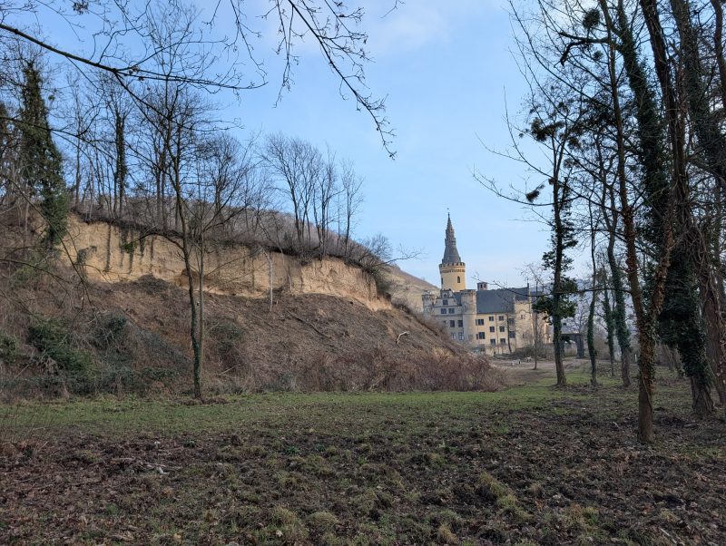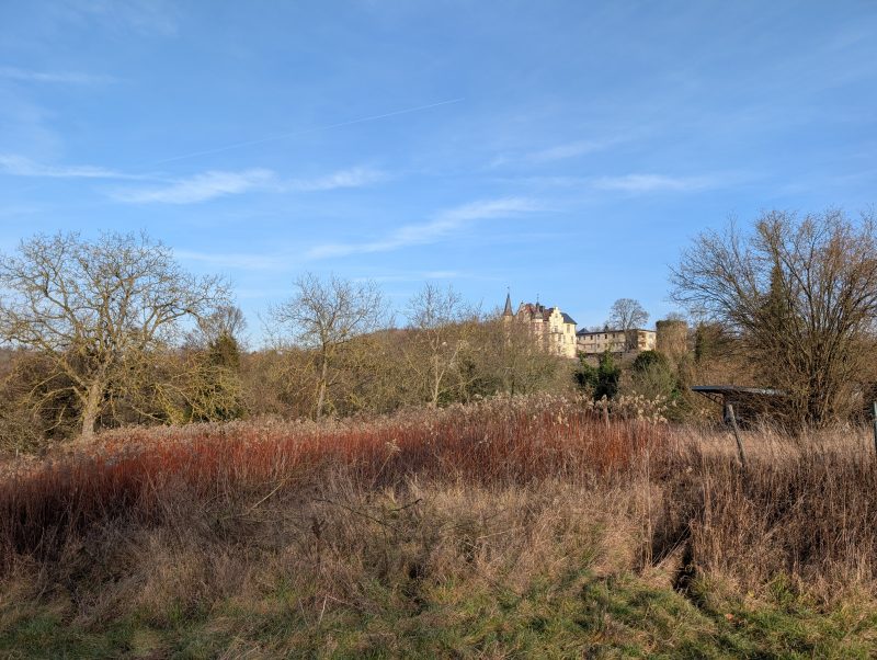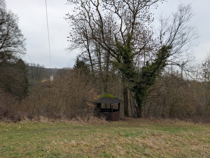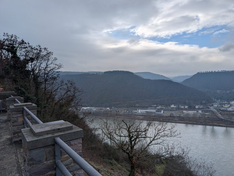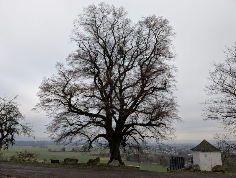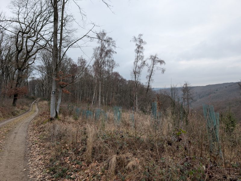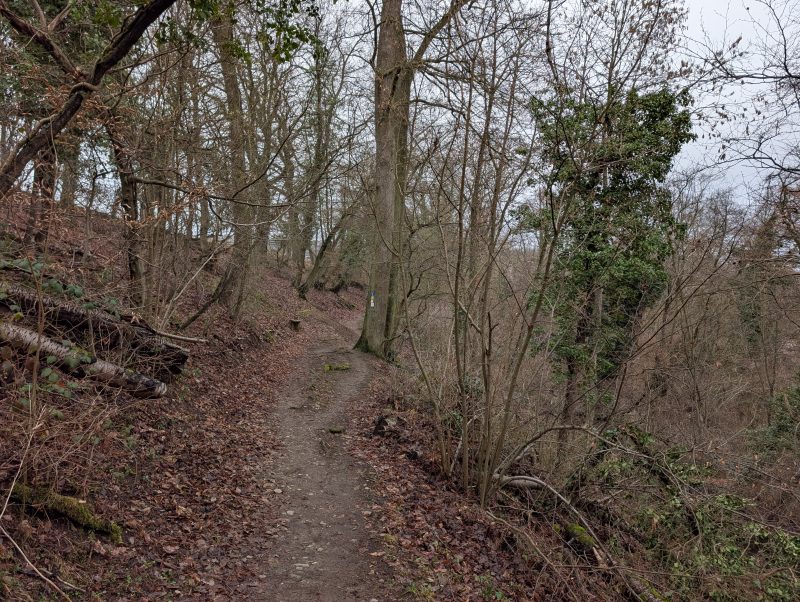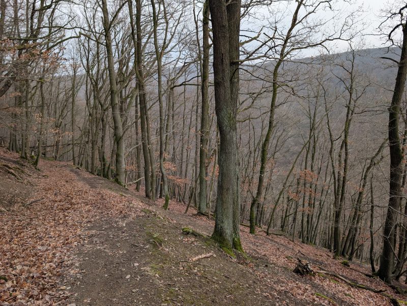 Der Wind ist noch kräftiger und kälter, aber der Rheinsteig am Westhang ist bis auf einen kleinen Abschnitt über eine Wiese auf der Hochfläche gut geschützt. Mit einem Stock wird bis auf einen Anstieg geschlauft, auch wenn die Beine verschiedenste Schmerzorte vermelden. Die Gegend ist auch am 24.12 gut besucht, wenn auch nicht überlaufen. Die Wege sind schmal bis breit, aber nicht wurzelig. Die Aussicht wird an mehreren Kanzelstellen bereitgestellt und zeigt das besiedelte Rheintal von Bad Godesberg bis Bonn.