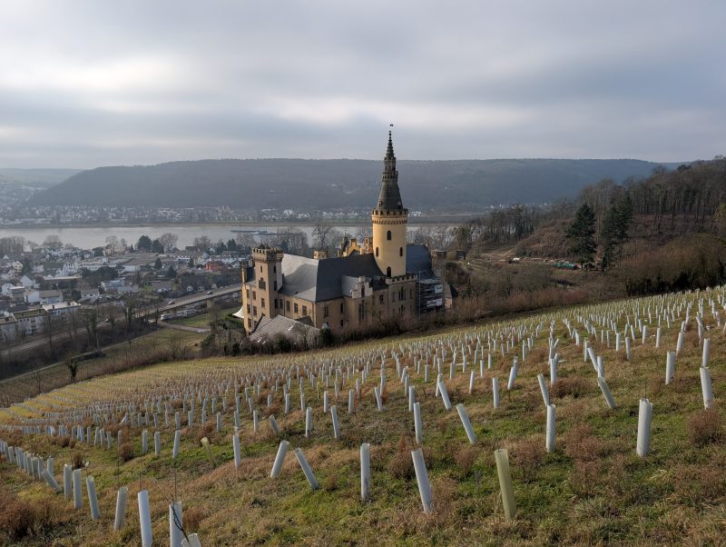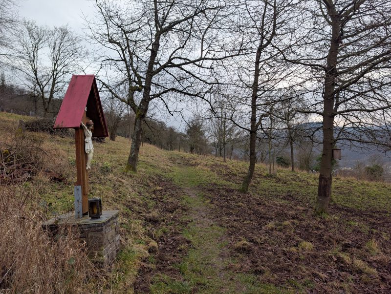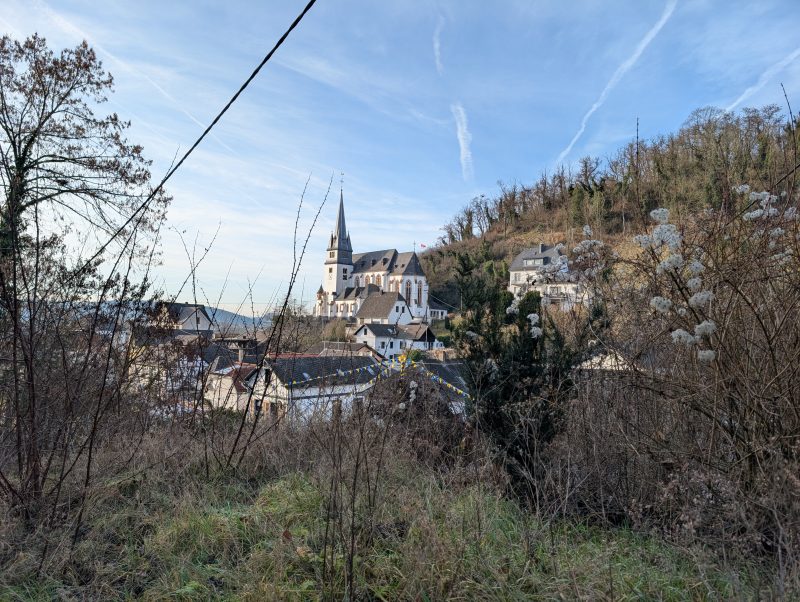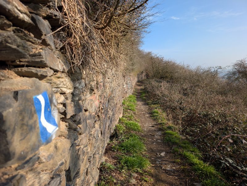 Mit Wintersonne geht es auf eine Zwischenetappe ohne landschaftliche Höhepunkte am unteren Rand von Bad Hönningen am Weinberg entlang. Bei Arienheller gibt es ein Wiedersehen mit dem Westerwaldsteig. Oberhalb von Rheinbrohl hinauf zum Hungerheck ist die Strecke nicht nur steil sondern weil oberflächlich angetaut auch extrem rutschig. Die Lehmschicht verklebt das Sohlenprofil und die Schuhe rutschen sehr leicht ab.