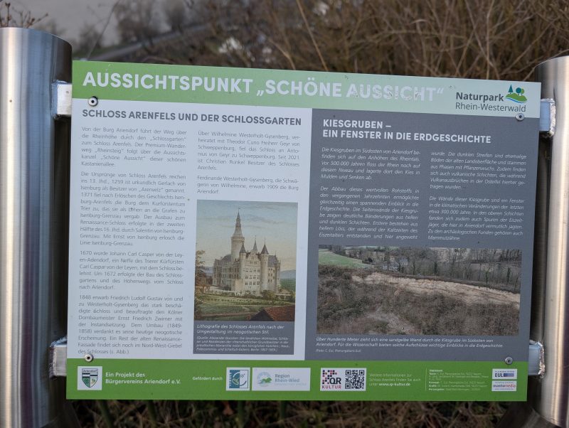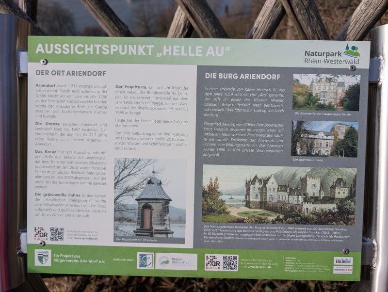 Wir parken an der L 257 in Bad Hönningen und wandern mit dem Rheinsteig zuerst zum Schloss Arenfels. Weiter geht es am Hang entlang bis Ariendorf und zu einem Aussichtspunkt oberhalb der Burg Ariendorf. Nach einer kurzen Rast warndern wir zurück zum Schloss Arienfels und von dort aus auf kürzerem Wege zurück zum Parkplatz.