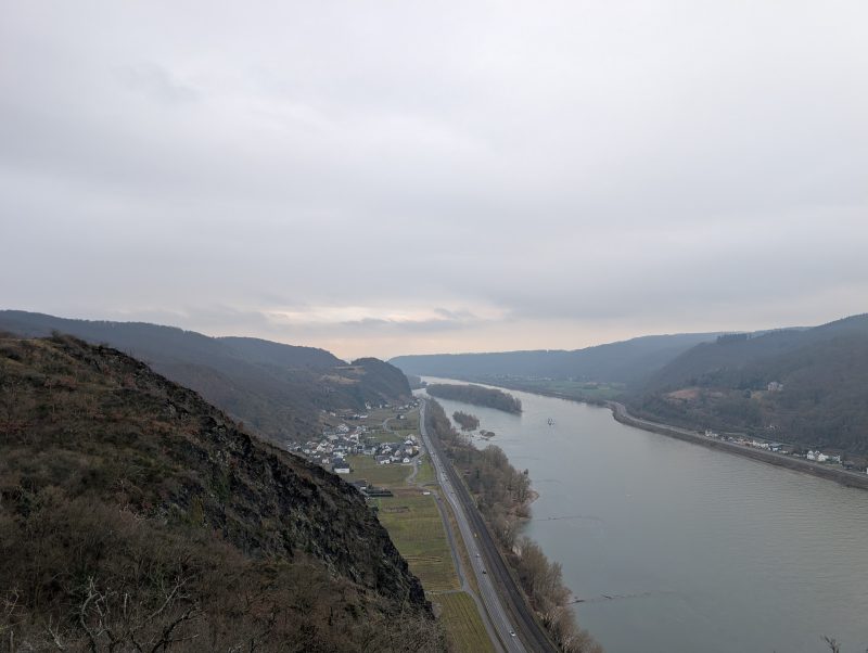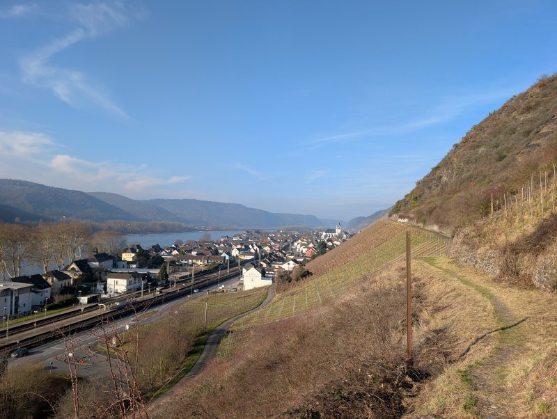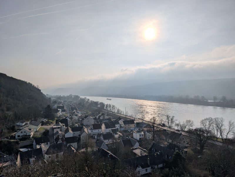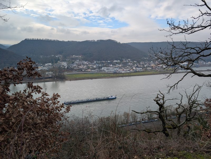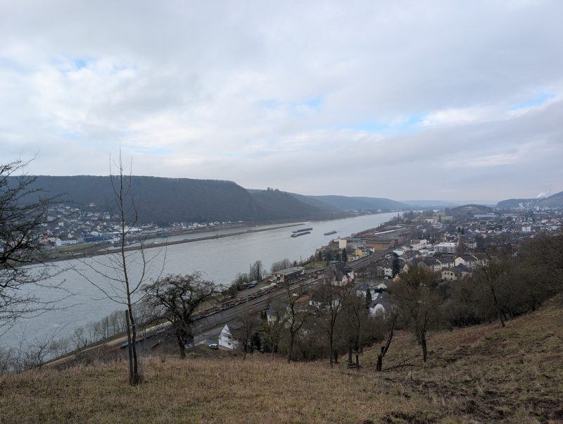 An einem Parkplatz in der Nähe der Kirche von Ockenfels starten wir unsere Wanderung. Zuerst geht es an der Burg vorbei und hinauf in Richtung Kasbach. Der Rheinsteig führt uns dann steil den Berg hinauf bis zum Aussichtspunkt Erpeler Ley. Da es dieses Mal ein sonniger Tag ist, haben wir klare Sicht hinunter ins Rheintal. Für den Rückweg nehmen wir ab Kasbach den Rheinradweg zurück bis Ockenfels.