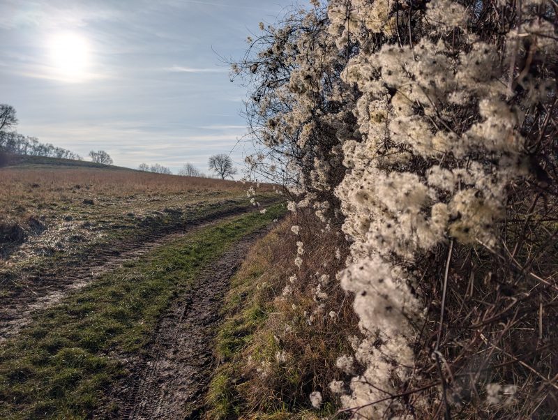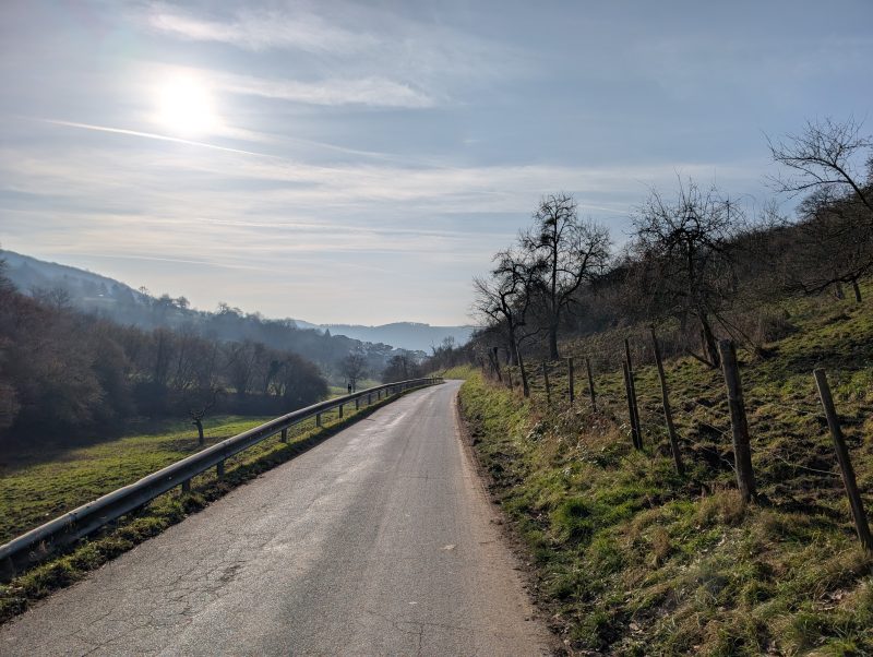 Samstag und Sonnentag, da kann man ja mal eine kleine Runde laufen und den Rheinsteig auf einem ruhigen Talverbindungsstück mit wenig anderen teilen. Nicht zu Steil sind die Wege in beide Richtungen noch gut zu schlurfen. Der Garmin Edge 1040 wird dabei erstmals am rechten Arm getragen und macht über Komoot oder Garmin Connect geladen beim Navigieren auf der Strecke einen guten Job. Die FR 965 ist am anderen Handgelenk deutlich schlechter nur nach Gelenkbewegung ablesbar und muss in der kalten Luft vom Jackenarm freigehalten werden. Der Edge ist immer im Blick und die Karte gut sichtbar und er piept vor einer Abbiegung. Und der Akku hält lang und kann über USB-C aufgeladen werden. Nachteil ist die automatische Klassifizierung der Aktivität als Radtour. Beim Start der Strecke über die Komoot App ist die Aktivität aber einstellbar. Dann kann die Aufzeichnung nur über den Edge erfolgen. Allerdings braucht es dann immer einen Brustgurt.